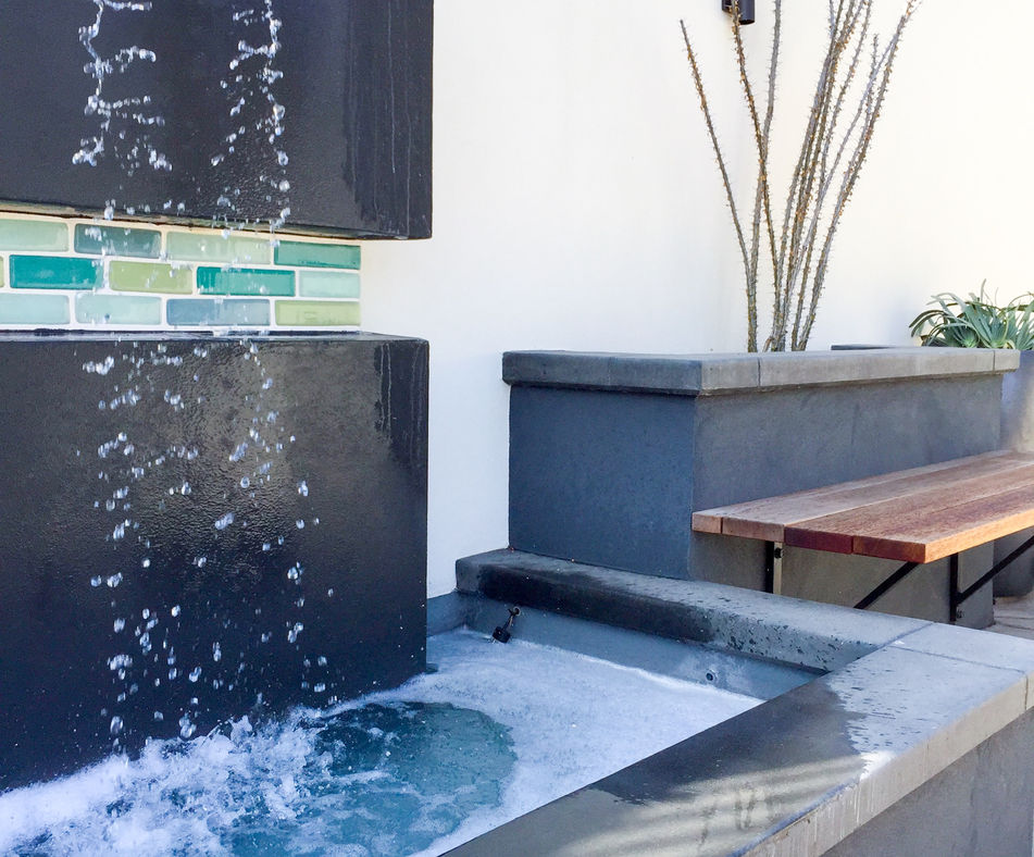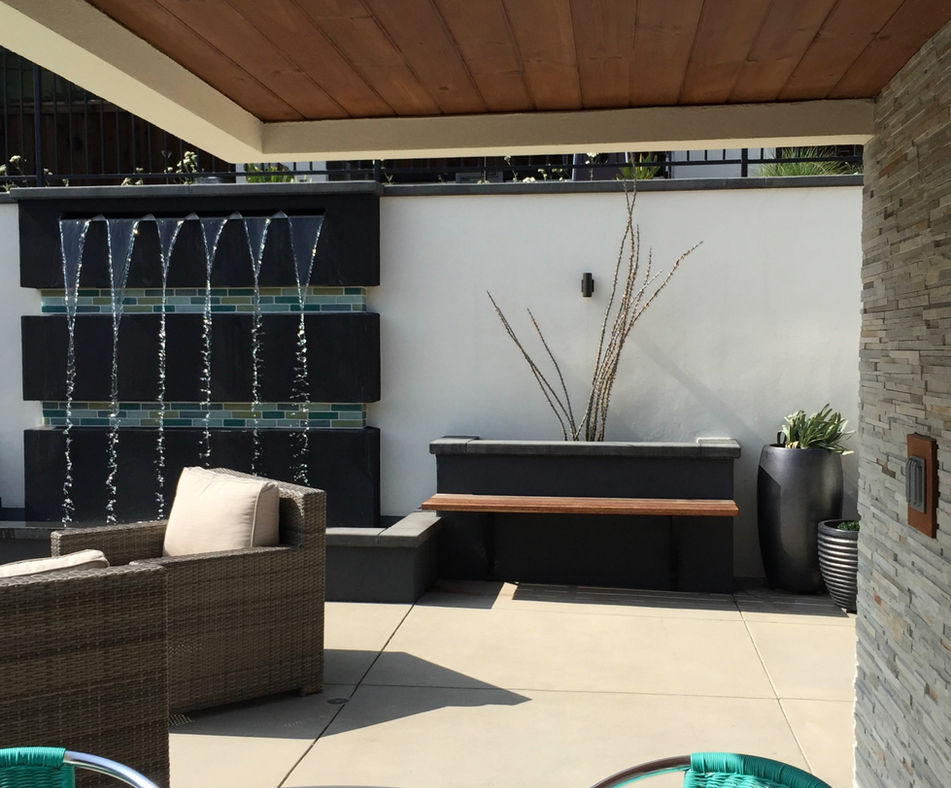 THE OUTDOOR SPACES WERE DESIGNED TO REFLECT THE CLIENTS' CONNECTION TO BOTH JOHANNESBURG AND SOUTHERN CALIFORNIA—PLACES WHERE LIFE NATURALLY UNFOLDS OUTDOORS. A CUSTOM 8-FOOT SHEER WATERFALL ANCHORS THE GARDEN AND CREATES A DRAMATIC FOCAL POINT WITHIN THE TERRACED COMPOSITION. A FULLY INTEGRATED OUTDOOR KITCHEN, LOUNGE AREAS, AND SHADED DINING SPACES SUPPORT EVERYDAY LIVING AND ENTERTAINING.