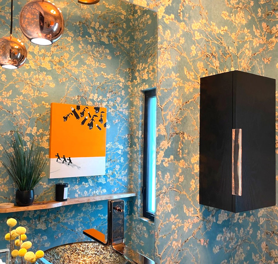 The kitchen CONTINUES the drama with MATTE black cabinetry, copper accents and a custom island CRAFTED from a single live edge SLAB with a waterfall detail. the client's favorite HUE REAPPEARS IN the powder room, WHERE van gogh's almond blossom wallpaper ENVELOPES THE WALLS. copper lighting and live edge FLOATING VANITY WITH A WALL MOUNTED COPPER TROUGH FAUCET continue the DIALOGUE BETWEEN NATURE AND ARTISTRY, EXTENDING THE HOME'S INSIDE AND OUT narrative IN LIVING COLOR..