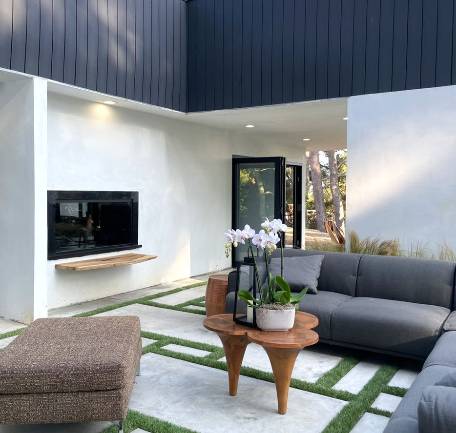 THE OPEN-PLAN LIVING AREA FEATURES A custom backlit GRAY ONYX slab facade. beautifully framing the DUAL-SIDED GAS FIREPLACE and THE NATURAL LANDSCAPE SURROUNDING THE HOME. An iconic mario bellini sofa ANCHORS THE SPACE, flanked by a floating media center and full wall of RECESSED TEAL shelving THAT DISPLAYS ART, BOOKS, AND family memorabilia.